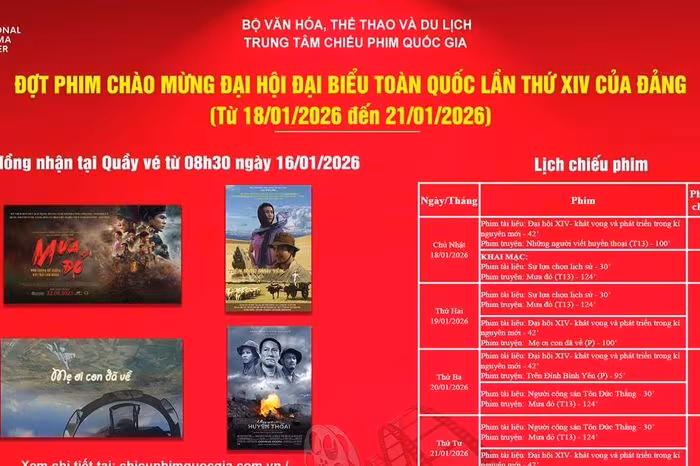 Trong không khí hào hùng chào mừng Đại hội đại biểu toàn quốc lần thứ XIV của Đảng, Trung tâm Chiếu phim quốc gia mở ra Đợt phim đặc biệt từ ngày 18‑21/1. Đây không chỉ là dịp để công chúng chiêm ngưỡng những tác phẩm điện ảnh, tài liệu có giá trị tư tưởng, mà còn là hành trình gợi nhớ và tôn vinh những câu chuyện lịch sử, văn hoá của dân tộc.